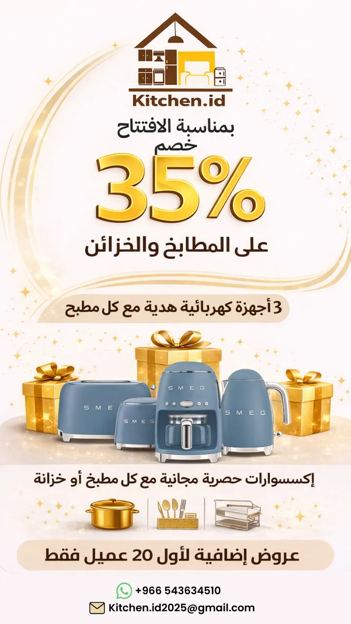 بمناسبة افتتاح معرض kitchen.id.. خصم 35% على المطابخ والخزائن مع هدايا أجهزة واكسسوارات مجاناً